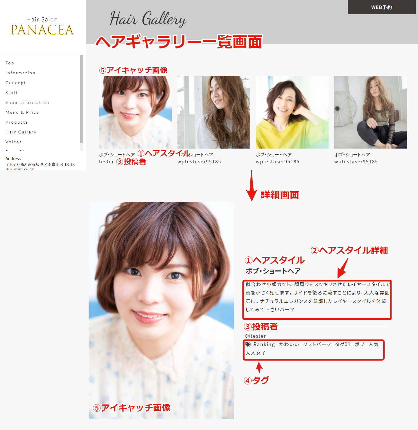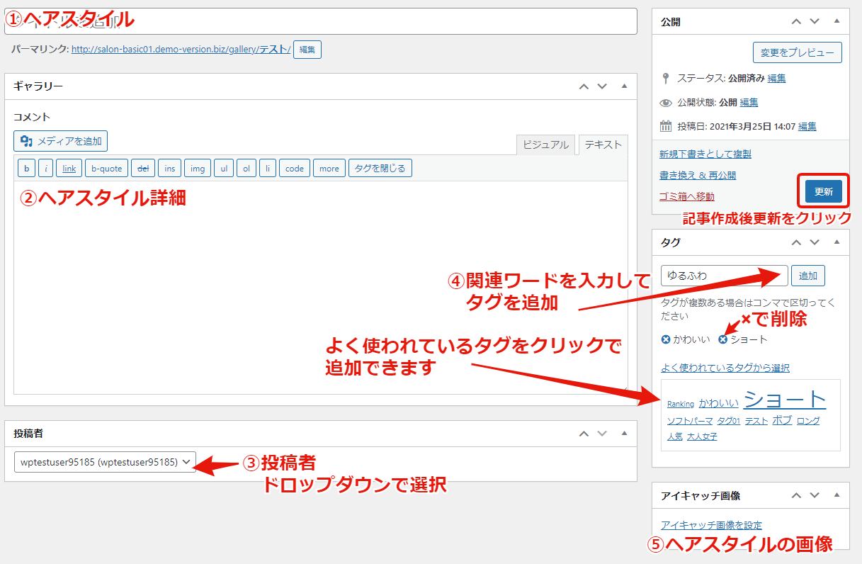 ⑤アイキャッチ画像・・・ヘアスタイル画像。一覧のサムネイルとページ内に表示されます。