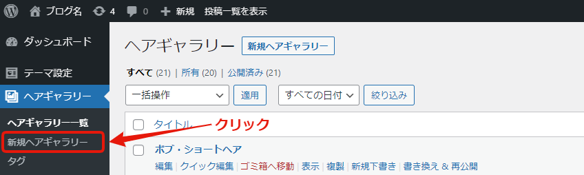 ヘアギャラリーから、新規ヘアギャラリーをクリック